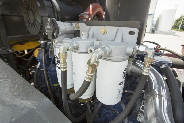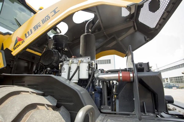机罩一键升降按钮设置在后配重,轻轻一按,机罩便可打开50°,露出燃油滤芯、机油滤芯、空气滤芯等保养点。站在地面就可进行日常维护。