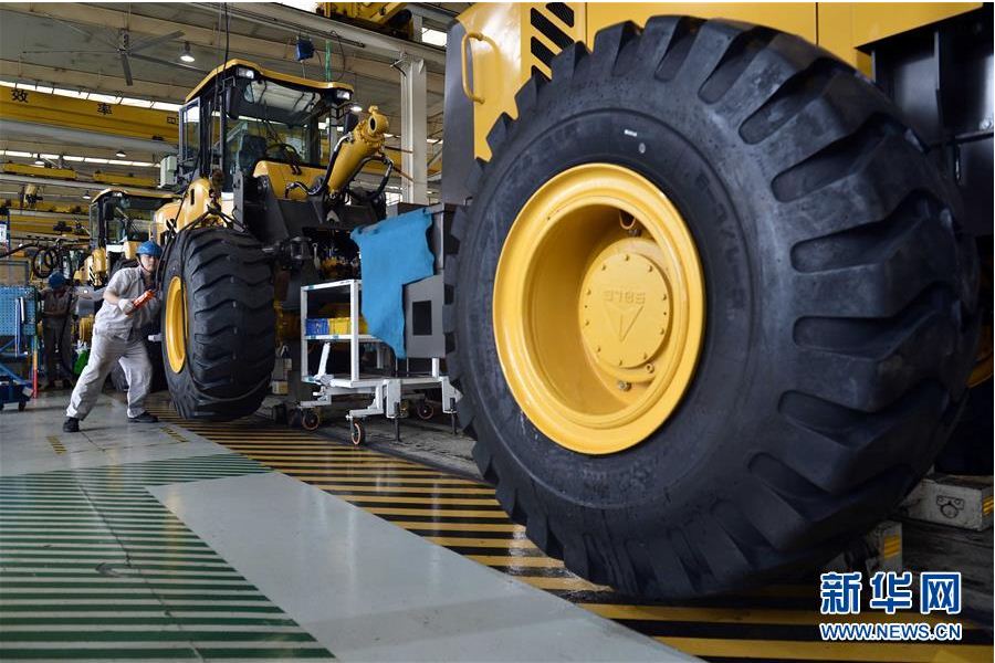 在山东南宫NG·28(中国)相信品牌力量工程机械有限公司,工人在装载机生产线作业
