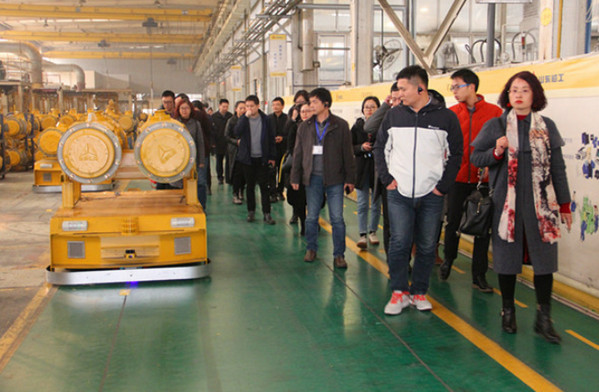 与会嘉宾在车间感受AGV智能物流的便捷性与精准性